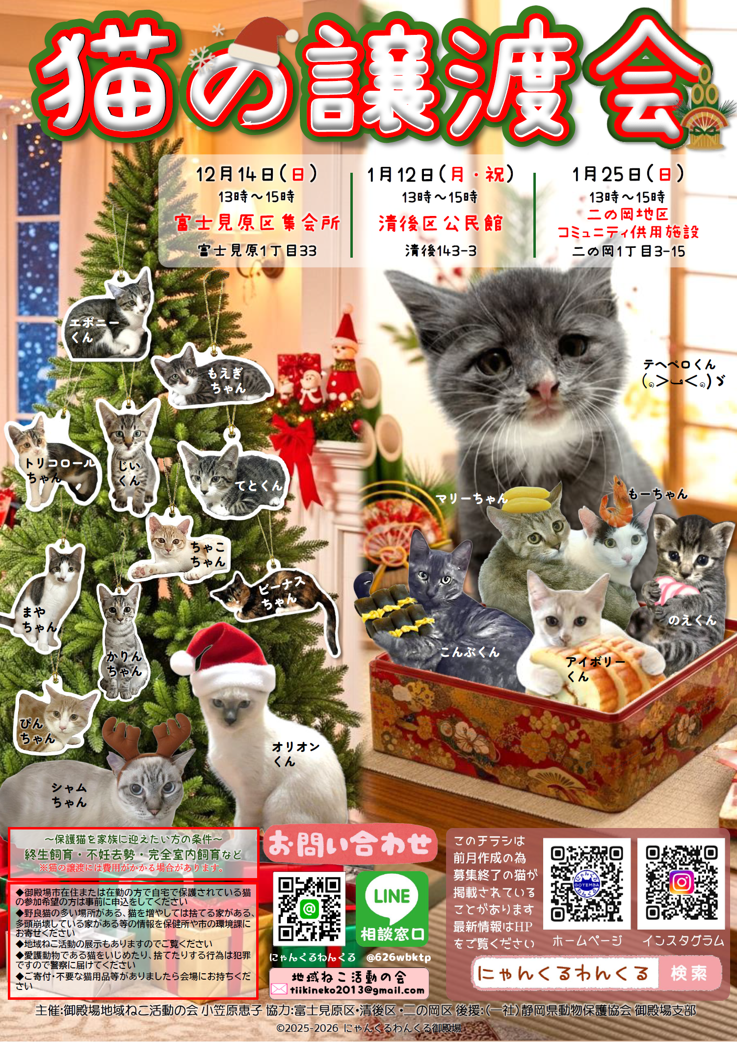 次回猫の譲渡会は 2025年12月14日(日) 13:00~15:00 永富士見原区集会所(富士見原1-33)にて開催されます 。